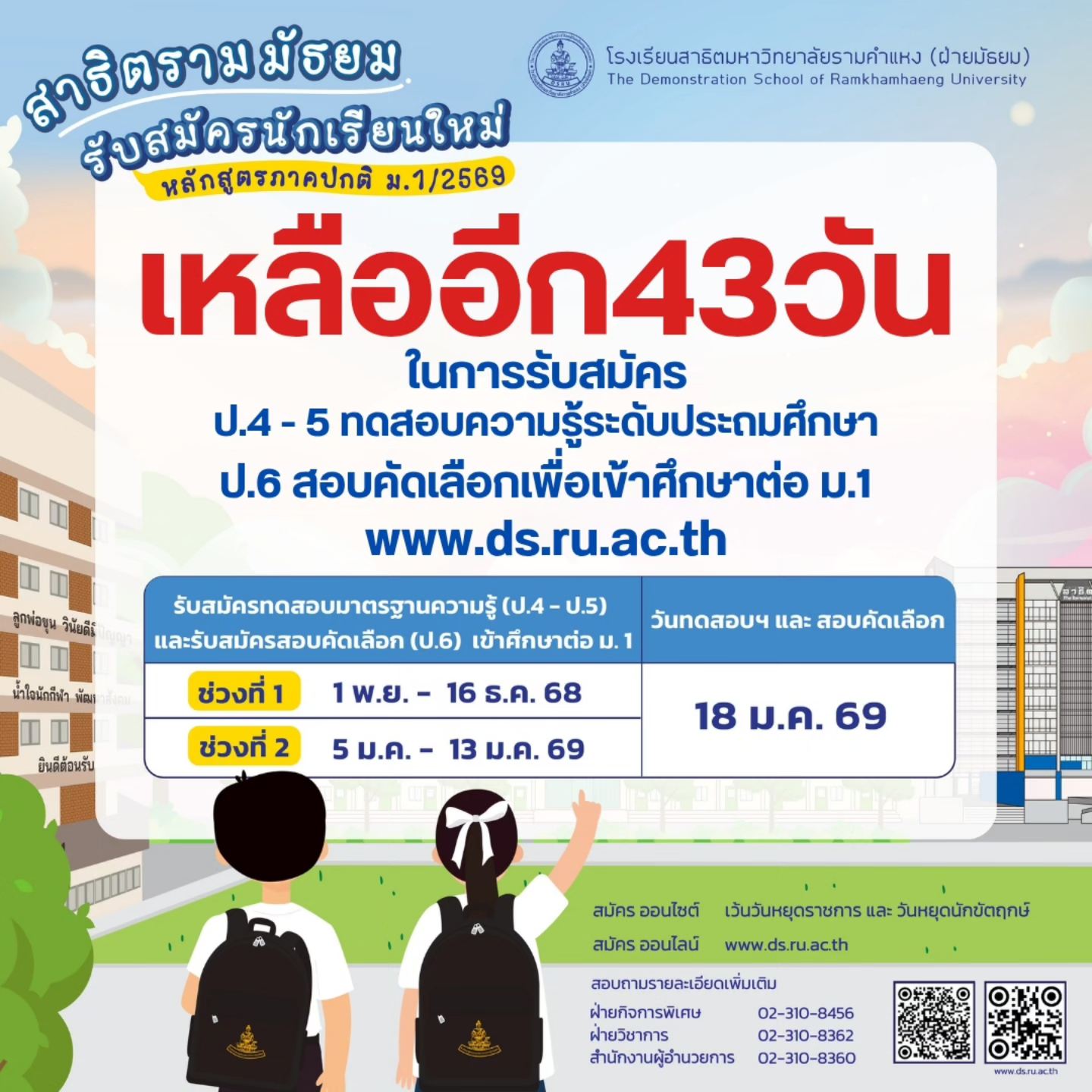 เหลือเวลาอีก 43 วัน! การรับสมัครสอบคัดเลือกเข้าศึกษาต่อระดับ ชั้นมัธยมศึกษาปีที่ 1 ปีการศึกษา 2569 สอบถามรายละเอียดเพิ่มเติมได้ที่ ฝ่ายกิจการพิเศษ โทร. 02-310-8456 ฝ่ายวิชาการ โทร. 02-310-8362 ![]()